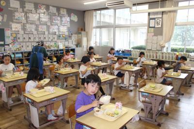 今日は朝からずっと雨です。途中、警報級の激しい雨も降って、外遊びはお預けでした。しかし、今日の給食は「カレー」です。みんな大好き「カレー」です。モヤモヤした天気を振り払うような笑顔で、おいしそうに食べる子どもたちでした。